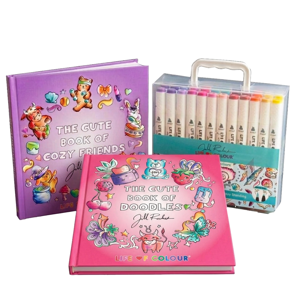 Cozy colouring lovers opgelet: dit is dé bundel waar je hart sneller van gaat kloppen. Jill’s volledig handgetekende cozy kleurboeken én eigen alcoholmarkers in één pakket. Perfect als je cozy colouring al helemaal ontdekt hebt, maar ook magisch als je er net instapt en meteen goed wil beginnen.
