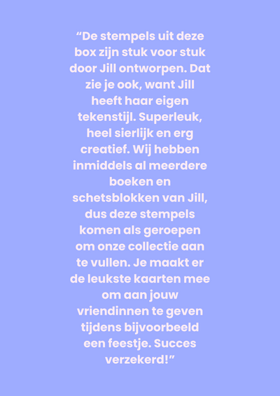 Met Jill's stempels heb je alles wat je nodig hebt om aan de slag te gaan! De set bevat 3 vellen op A5-formaat, met in totaal meer dan 100 unieke stempels met prachtige, gedetailleerde illustraties van Jill.
